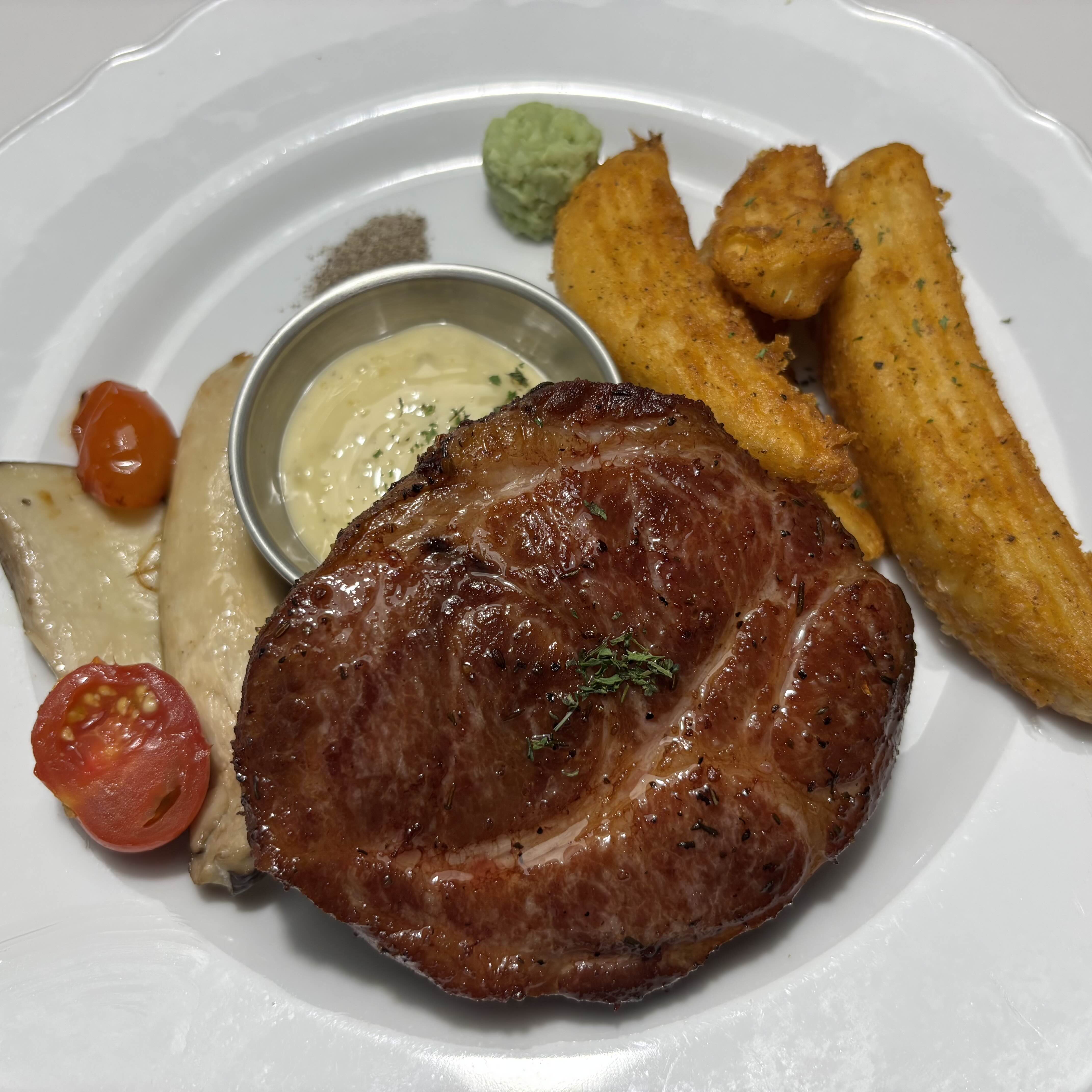 수비드 목살 스테이크는 겉은 바삭하게, 속은 부드럽고 촉촉한 육즙이